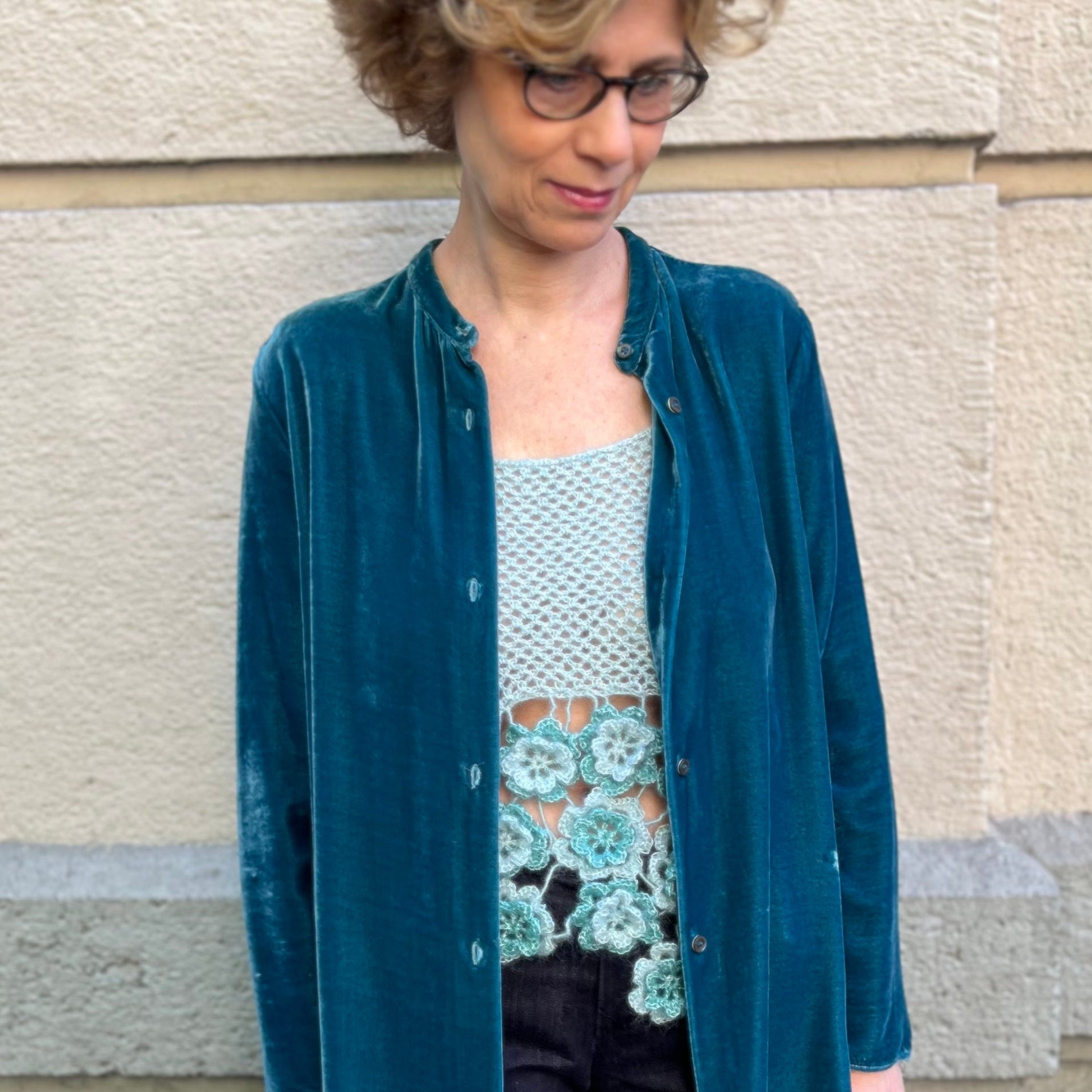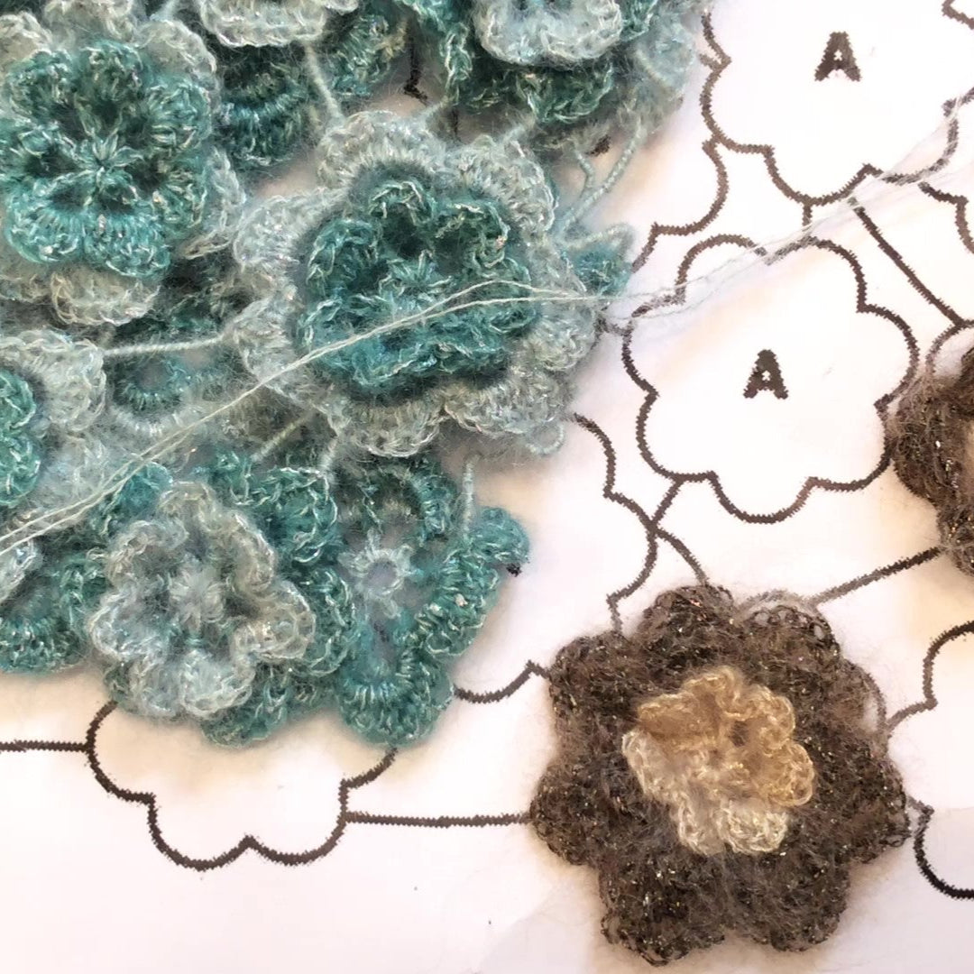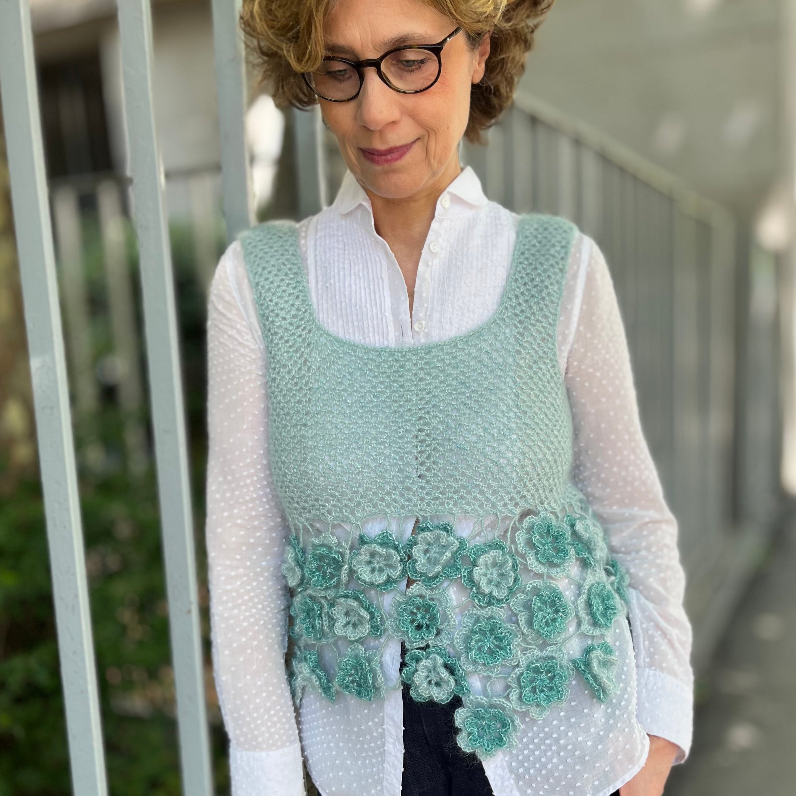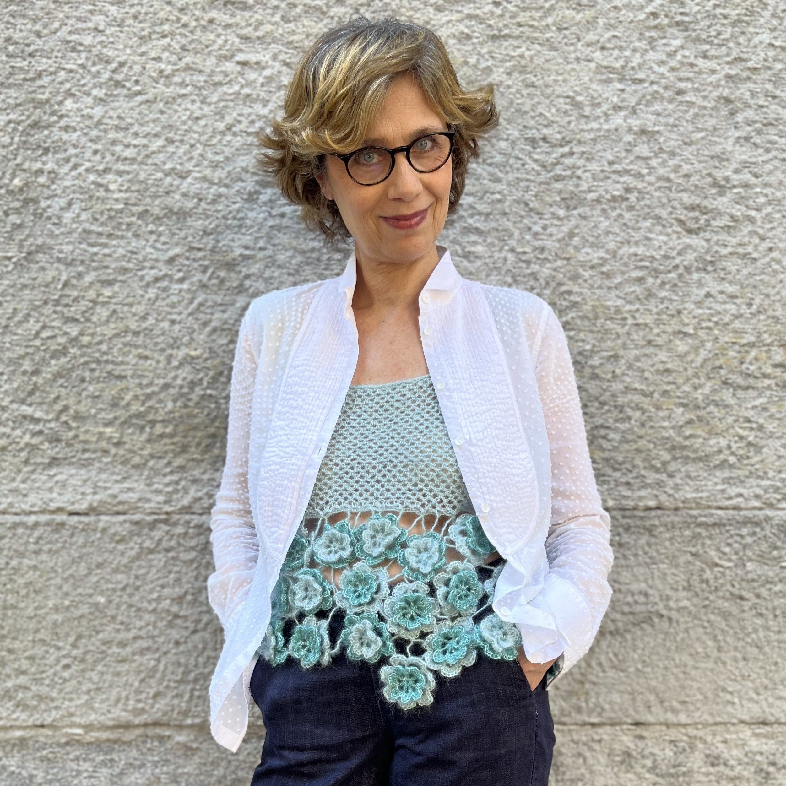 Coniuga eleganza e originalità la canotta realizzata abbinando un filato caldo e morbido, come il mohair e seta, a un filato brillante di lurex. La canotta ha un ampio scollo quadrato, larghe spalline e una baschina ottenuta unendo fra loro rose d’Irlanda di misure diverse.