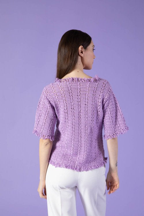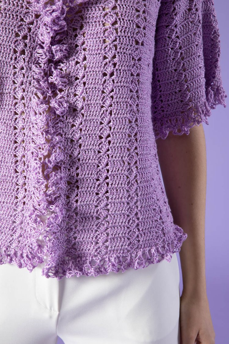 Delicata tonalità di glicine per il mini cardigan realizzato all’uncinetto con Cotton Light di Miss Tricot Filati. Una vaporosa rouge a punto strega gli dona un tocco romantico.