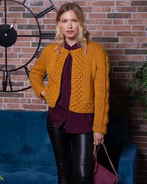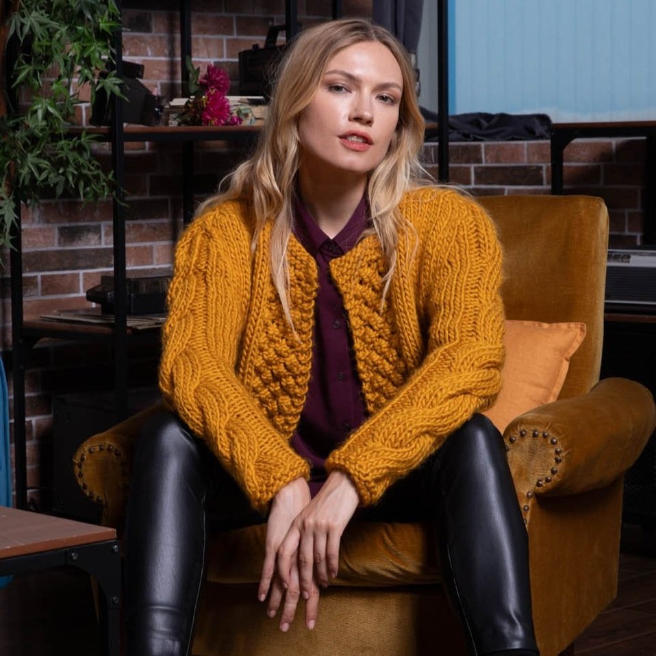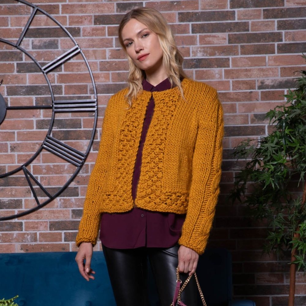 Nuovi colori, nuove proporzioni e punti della tradizione Aran per il Cardigan che sfida l’inverno con il filato 100 Grammi di miss tricot filati