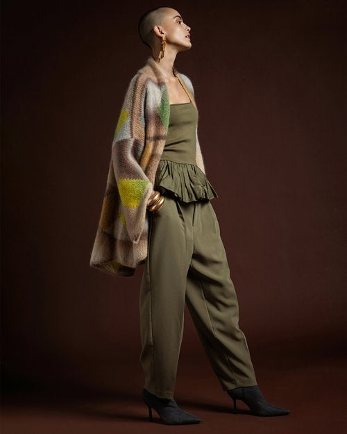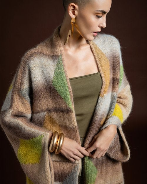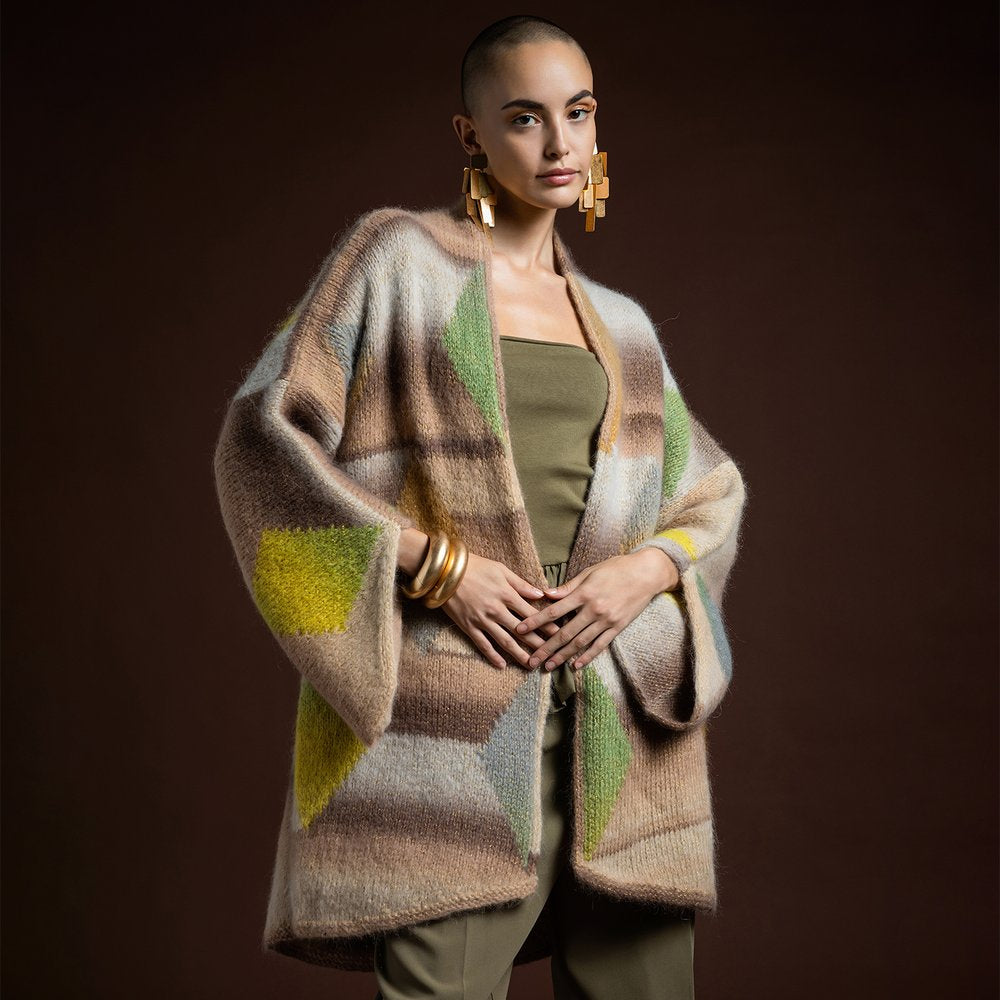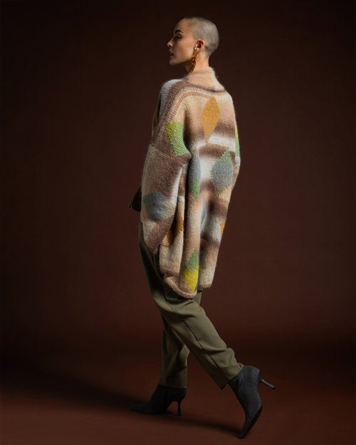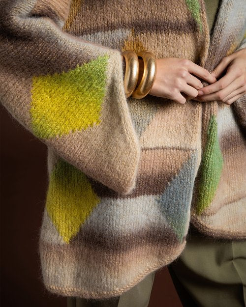 Particolari dettagli del cardigan sono la linea a trapezio con grafismi e giochi di colori, realizzato con il filato Ninfea di Miss Tricot Filati in superfine alpaca e lana merino con tocchi di lamè e una meravigliosa gamma colori.