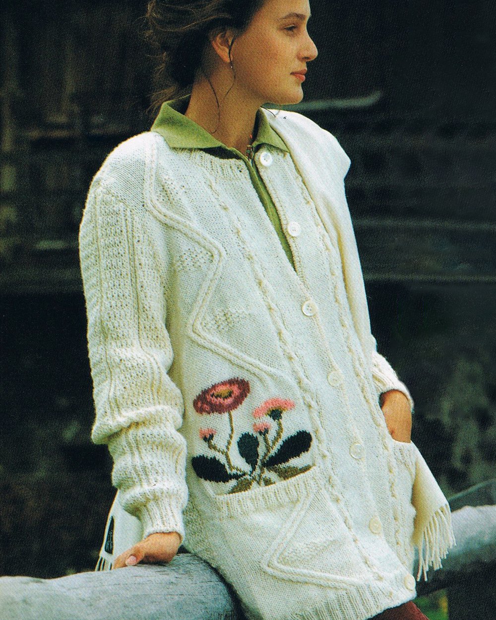 Fiori stilizzati a più colori disegnano i due davanti realizzati con punti in rilievo e con ampie tasche inserite.