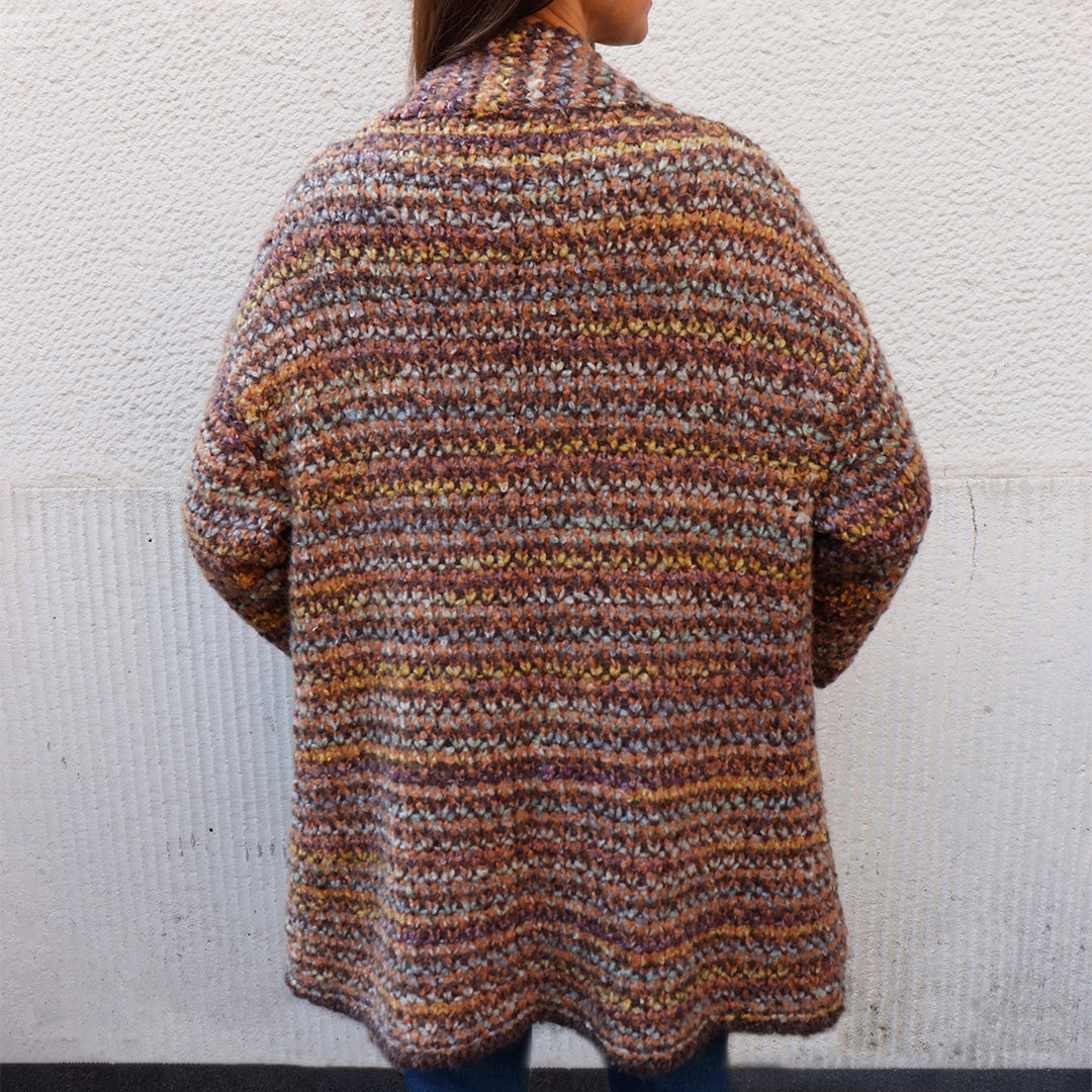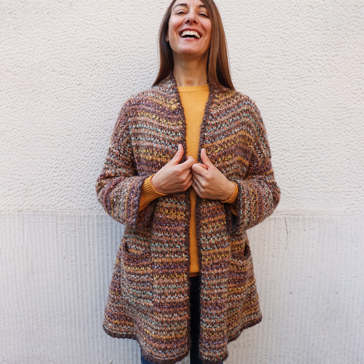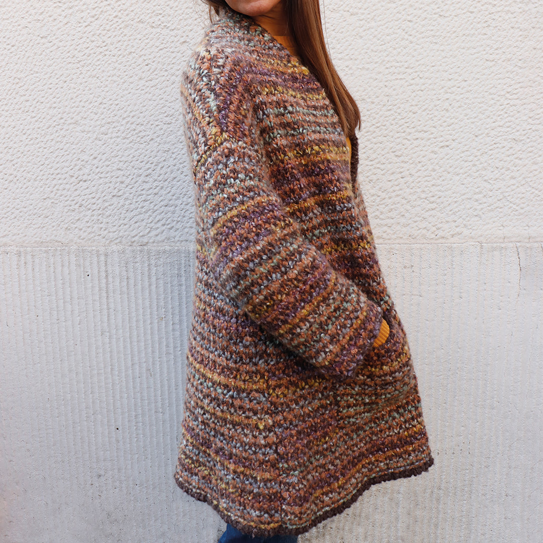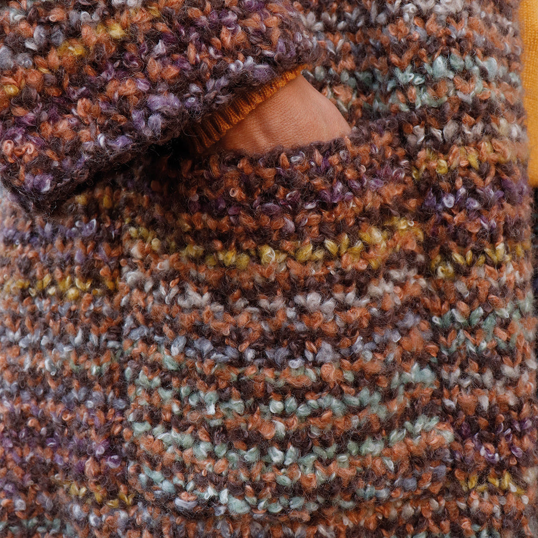Abbiamo scelto per la Giacca Donegal un mix di 3 colori che ricordano le torbiere del nord, lavorandoli a punto tramato per valorizzare il raffinato bouclè Shibuya di Concept by Katia. La linea della giacca è destrutturata e comoda con una particolare modellazione