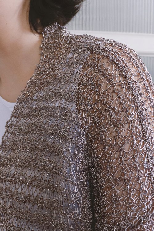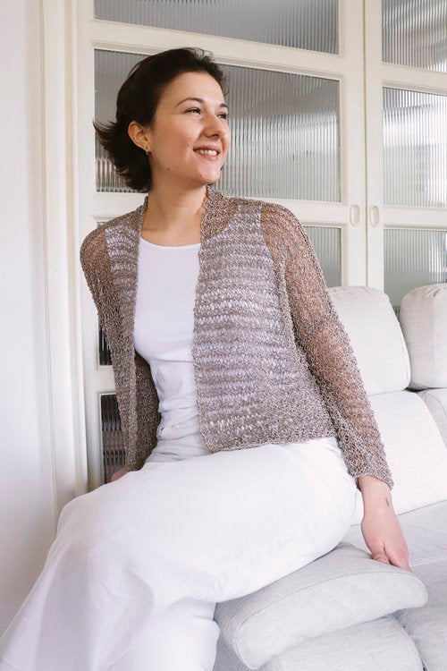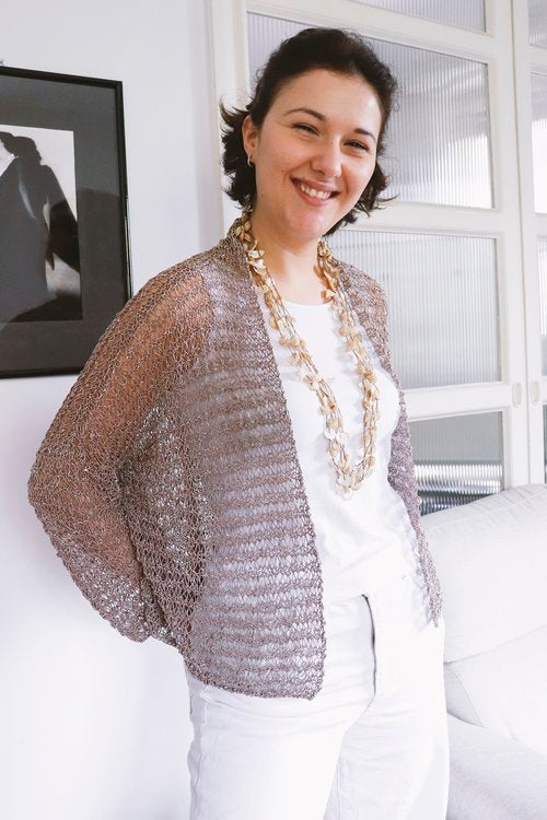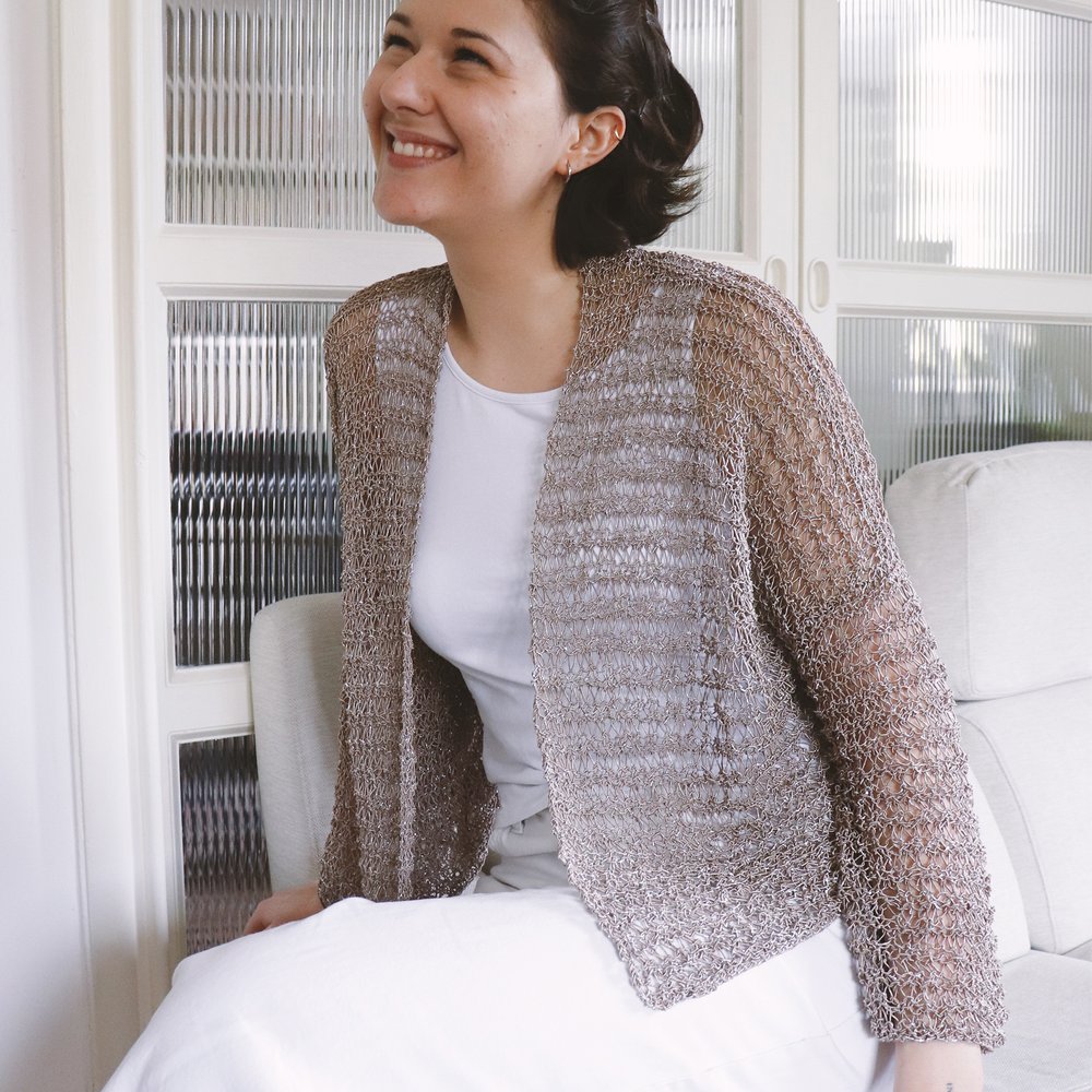 Nuova giacca modello chanel e nuovo filato lyse di concept by katia, setoso, lucido e brillante, very chic in cotone-lino con un inedito punto rete