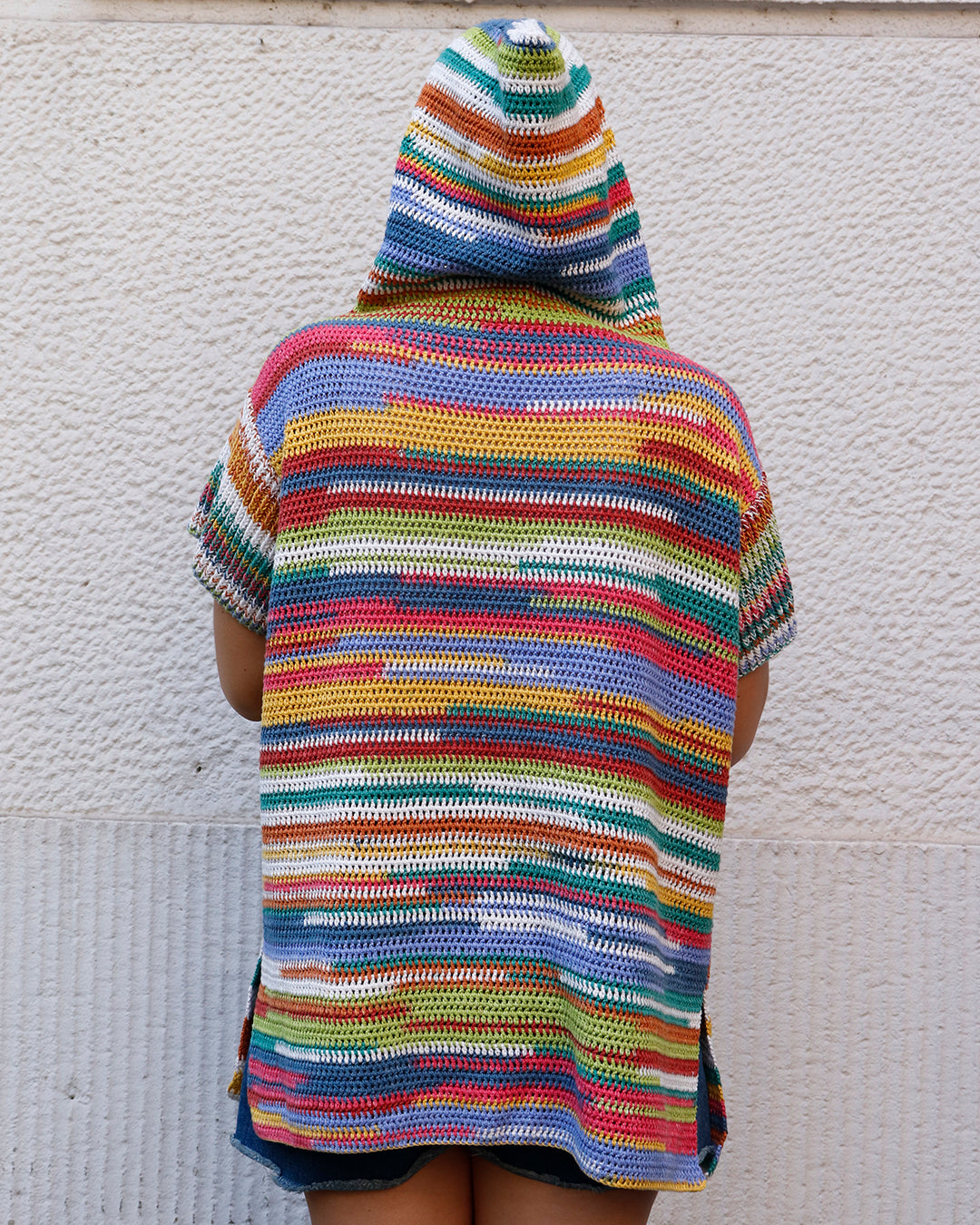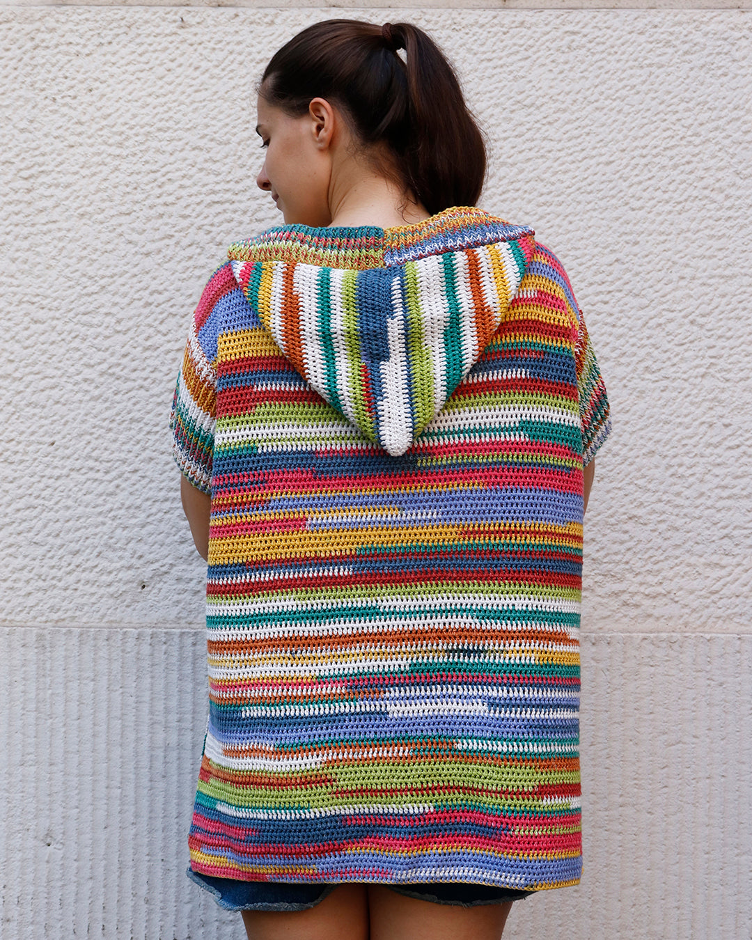 Un divertente arcobaleno con tutti i colori dell’estate lavorati a maglia alta all’uncinetto per il maxi gilet indispensabile in ogni guardaroba per divertenti outfit d’estate