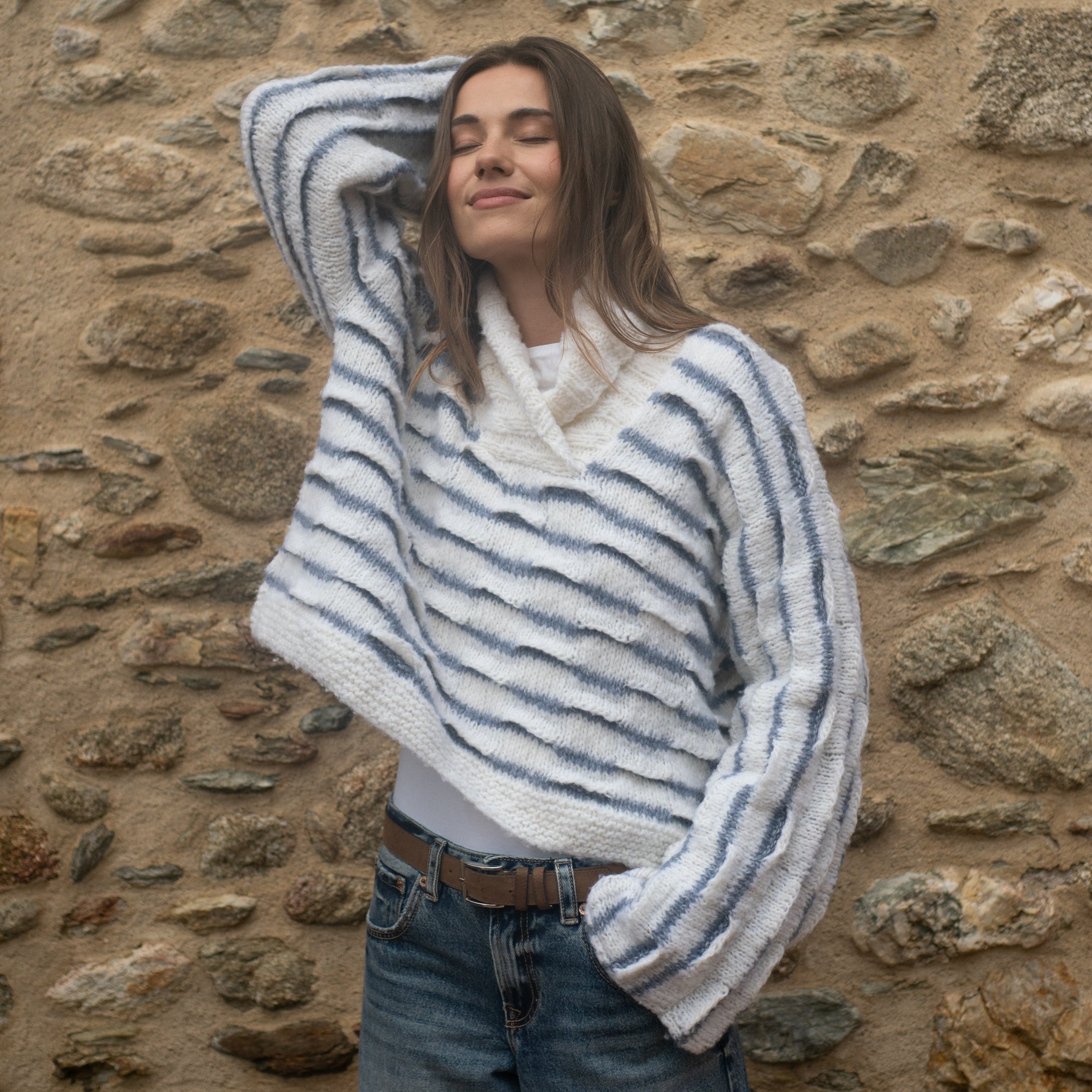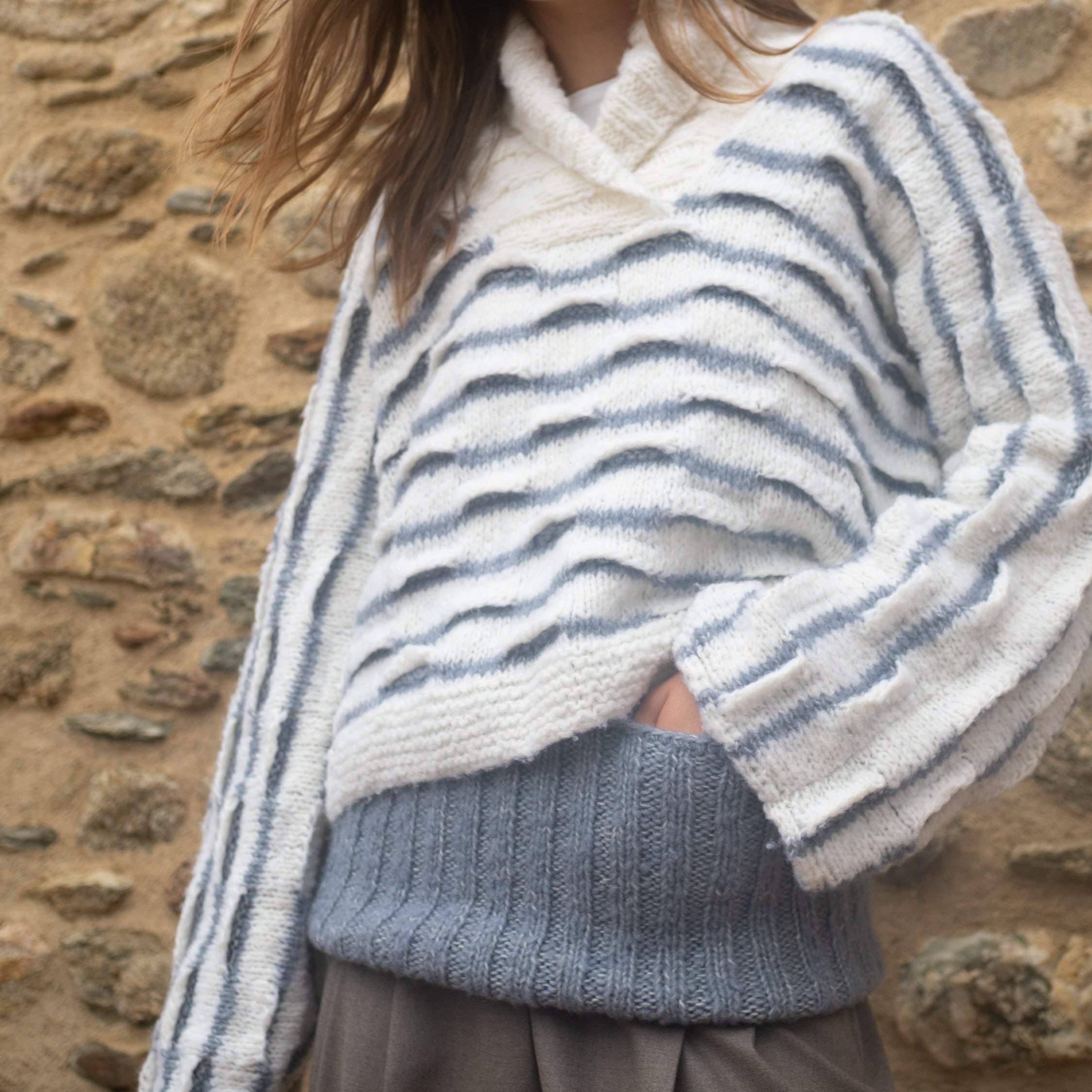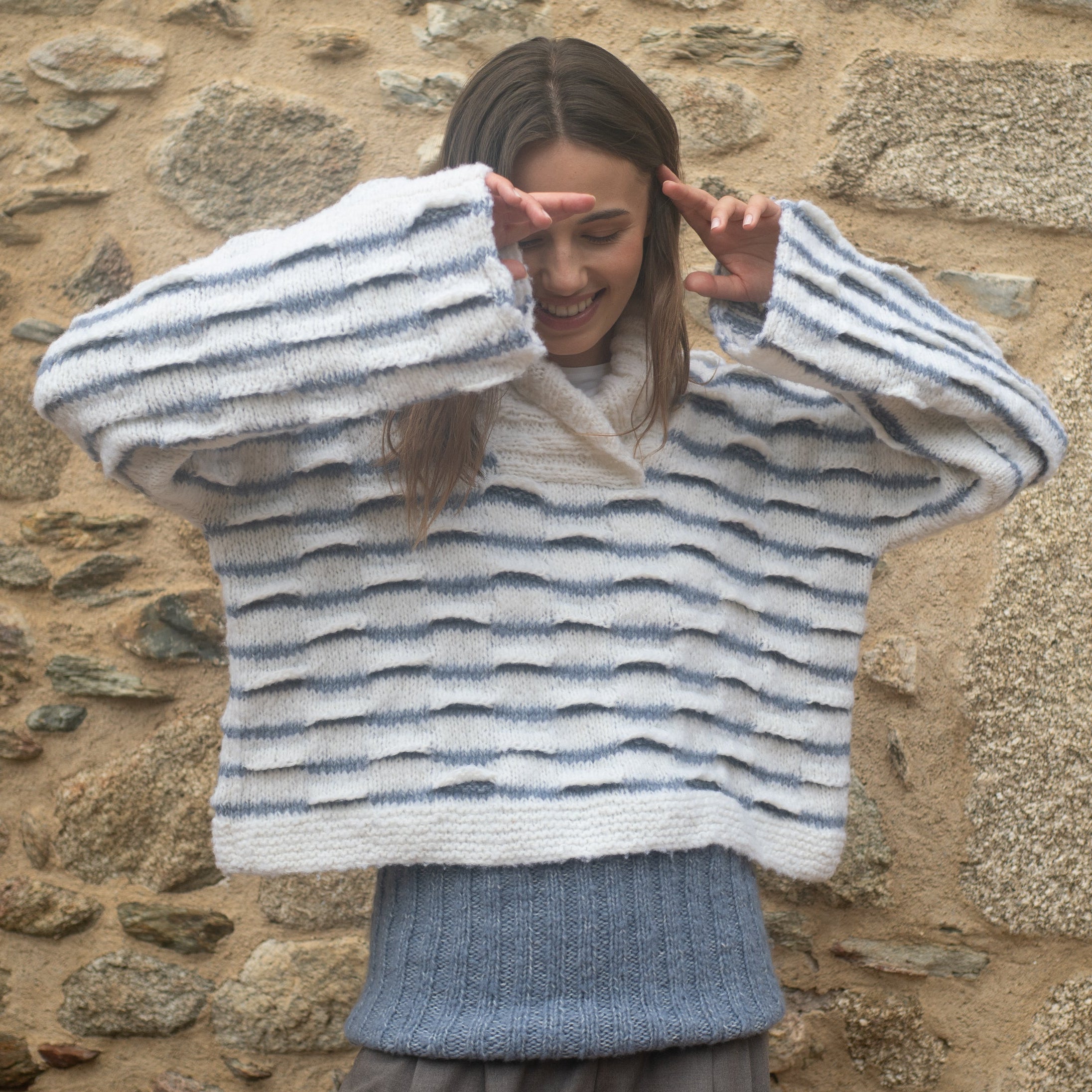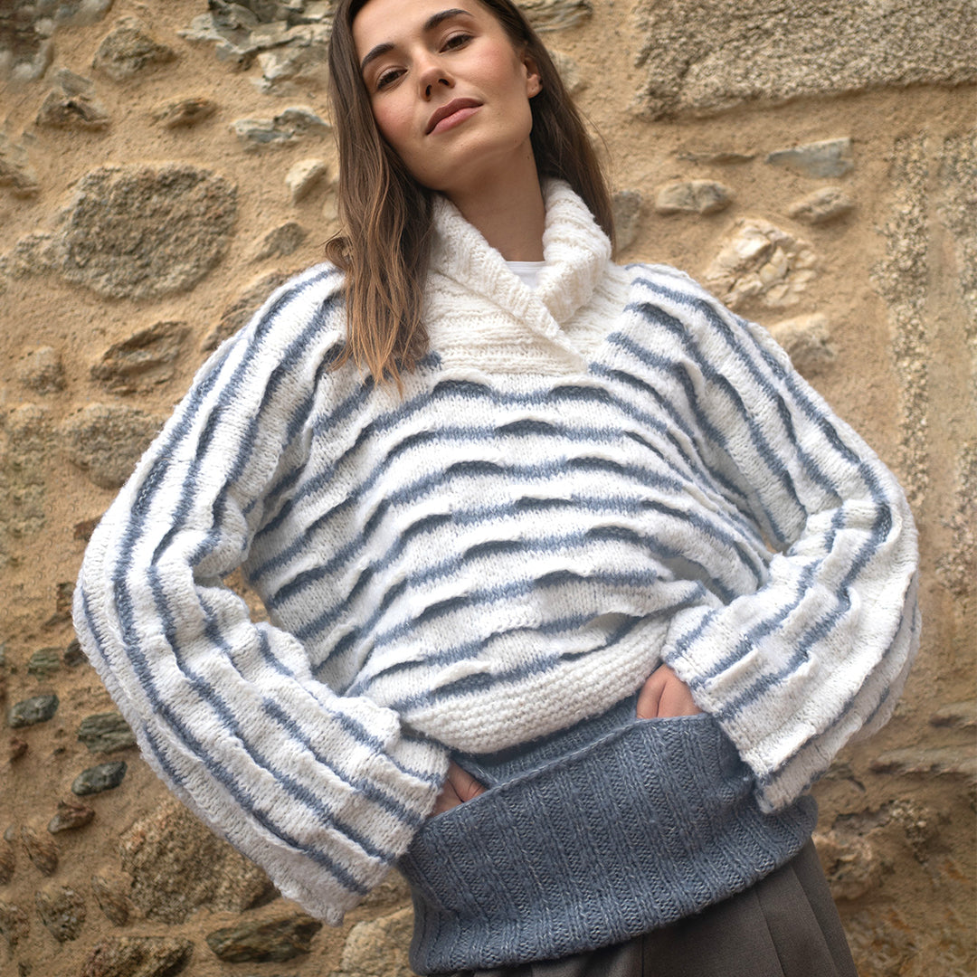 Omaggio ai giochi olimpici invernali di Milano Cortina. Il Pull Giochi di Neve è lavorato con il “punto a onde in rilievo” su maglia rasata. Il filato protagonista, soffice e leggero, è Carezza di Concept by katia
