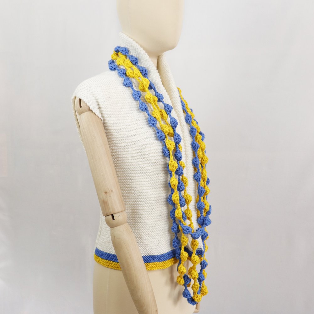 - Utilizzare il colore Celeste n.35 e il colore Giallo n.16 del gilet della pace ma lavorando il lato messo doppio