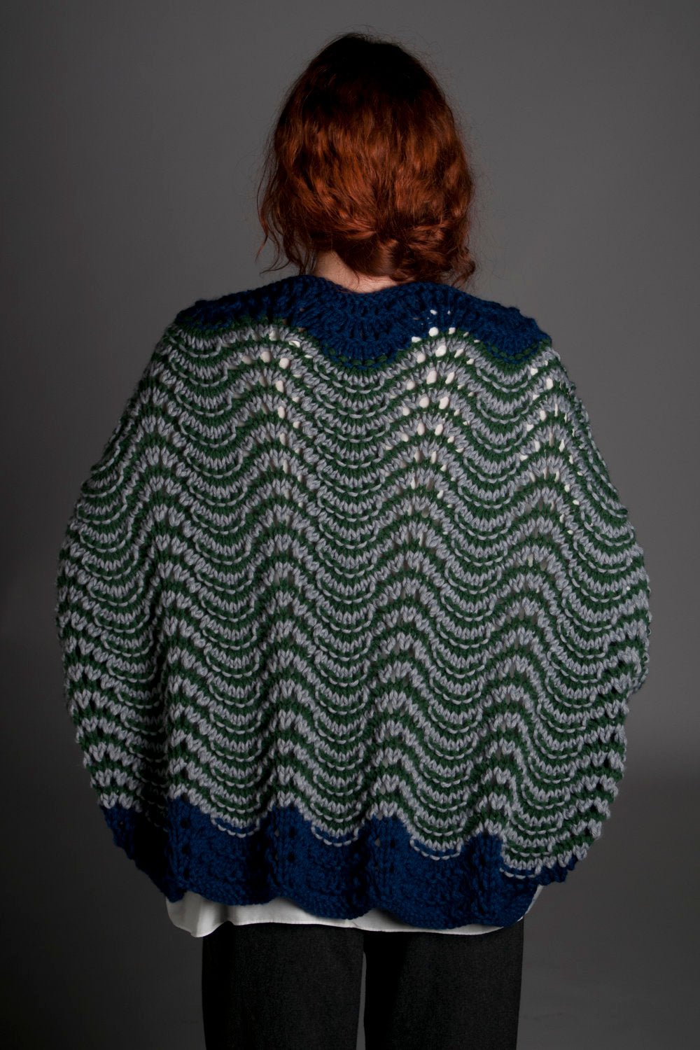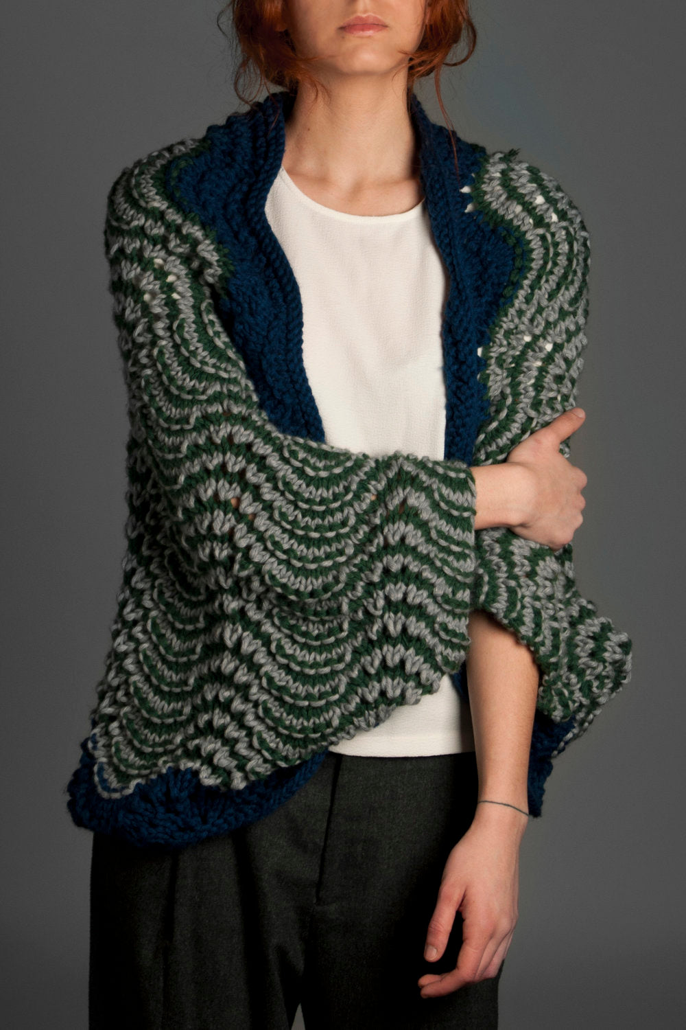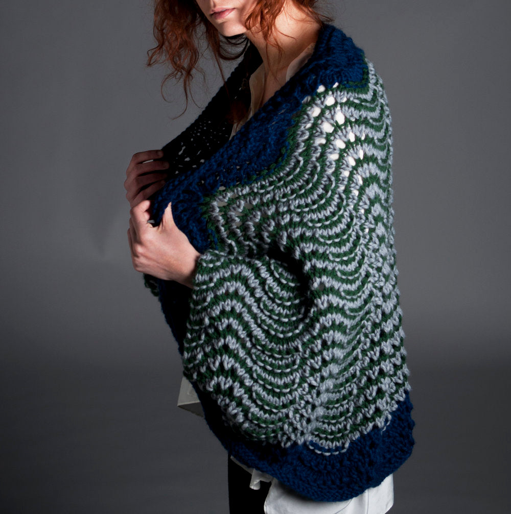 La maxi stola a punto pavone bicolore, impreziosita dal bordo in tinta unita, è lavorata in un unico modulo e confezionata con un espediente che la rende allo stesso tempo speciale e facile da realizzare. Abbiamo scelto il punto pavone per la sua eleganza senza tempo, l’accostamento colori è studiato in due varianti: nei toni freddi – blu, verde e grigio – e nei toni caldi – grigio, ruggine e cammello, incorniciate da un bordo a contrasto che sottolinea il motivo a onde come un abbraccio.