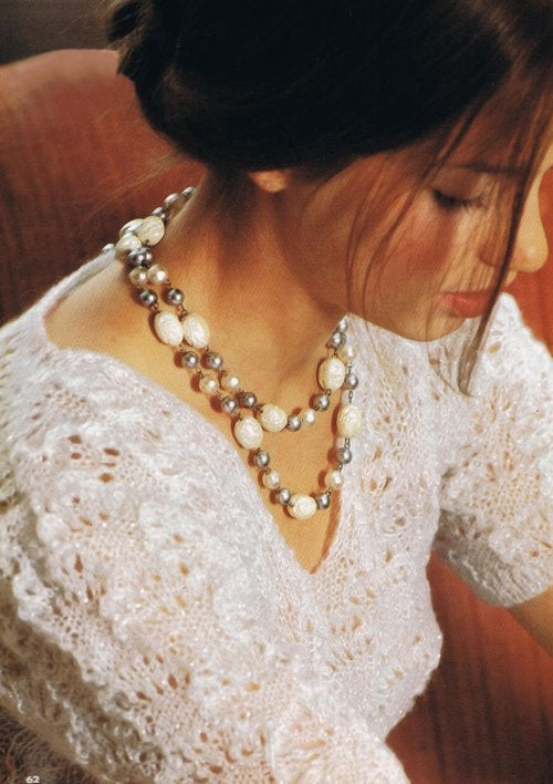 Trafori e rilievi accostati con leggerezza nella bellezza del punto pavone. Prezioso come un pizzo, ecco il piccolo pullover da sera a mezze maniche, con scollo a “V”