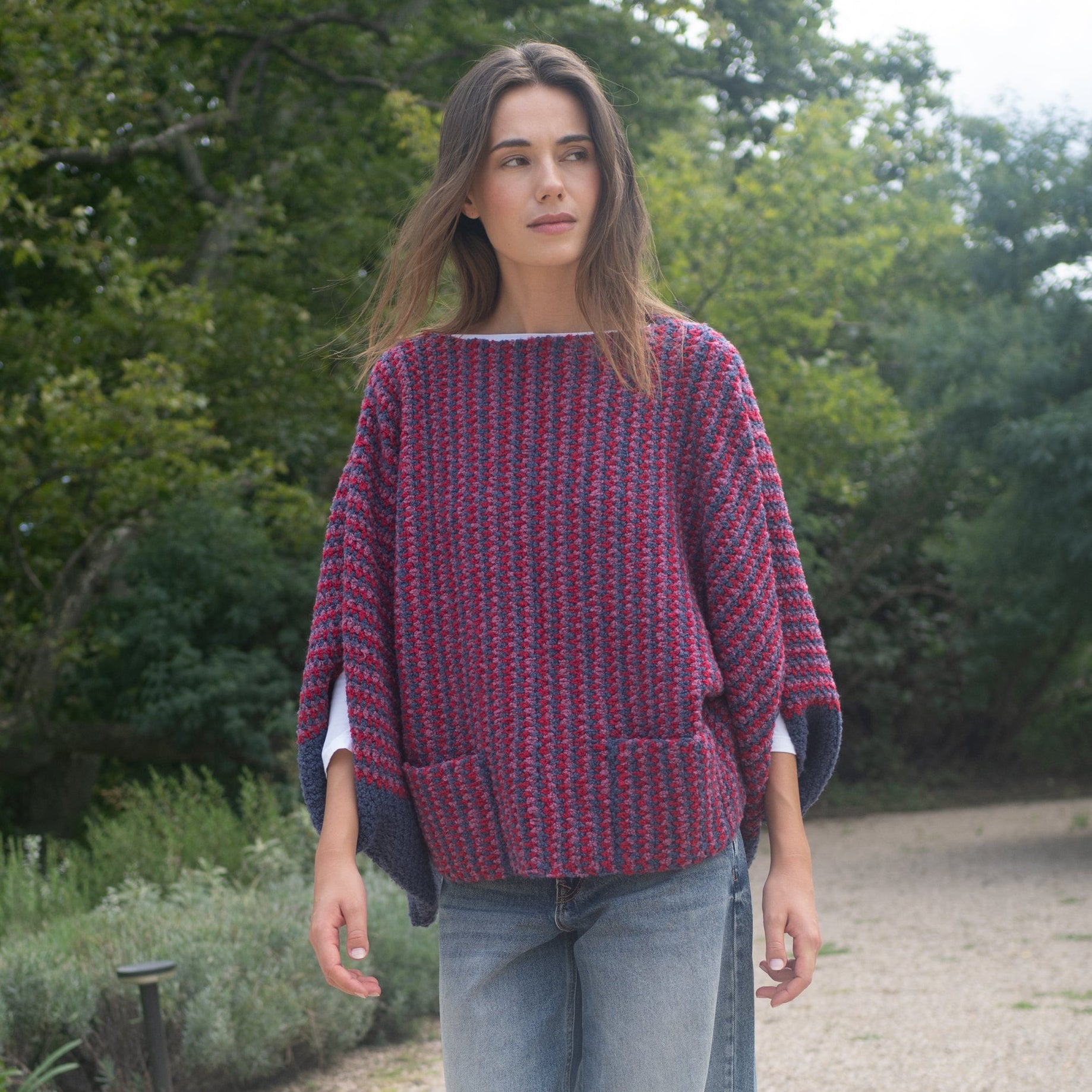 Pattern all'uncinetto lavorato a tre colori. Il nuovo poncho con le maniche a kimono l'abbiamo realizzato con il filato "Sussurro" di Katia Yarns & Fabrics, un particolare bouclé in 100% lana calda e confortevole