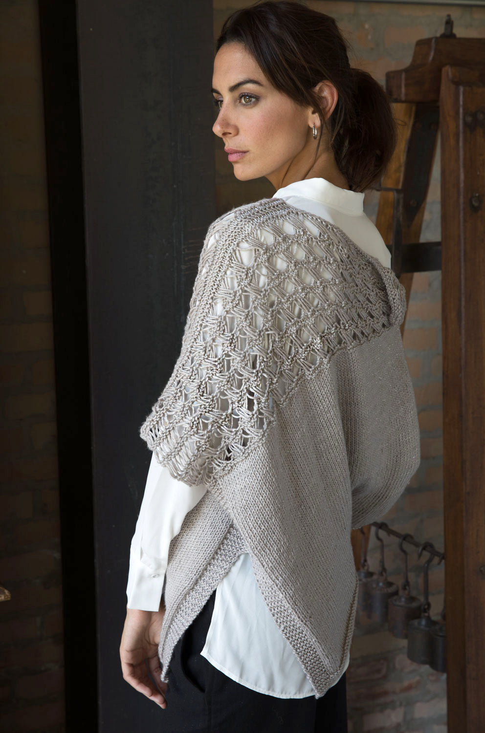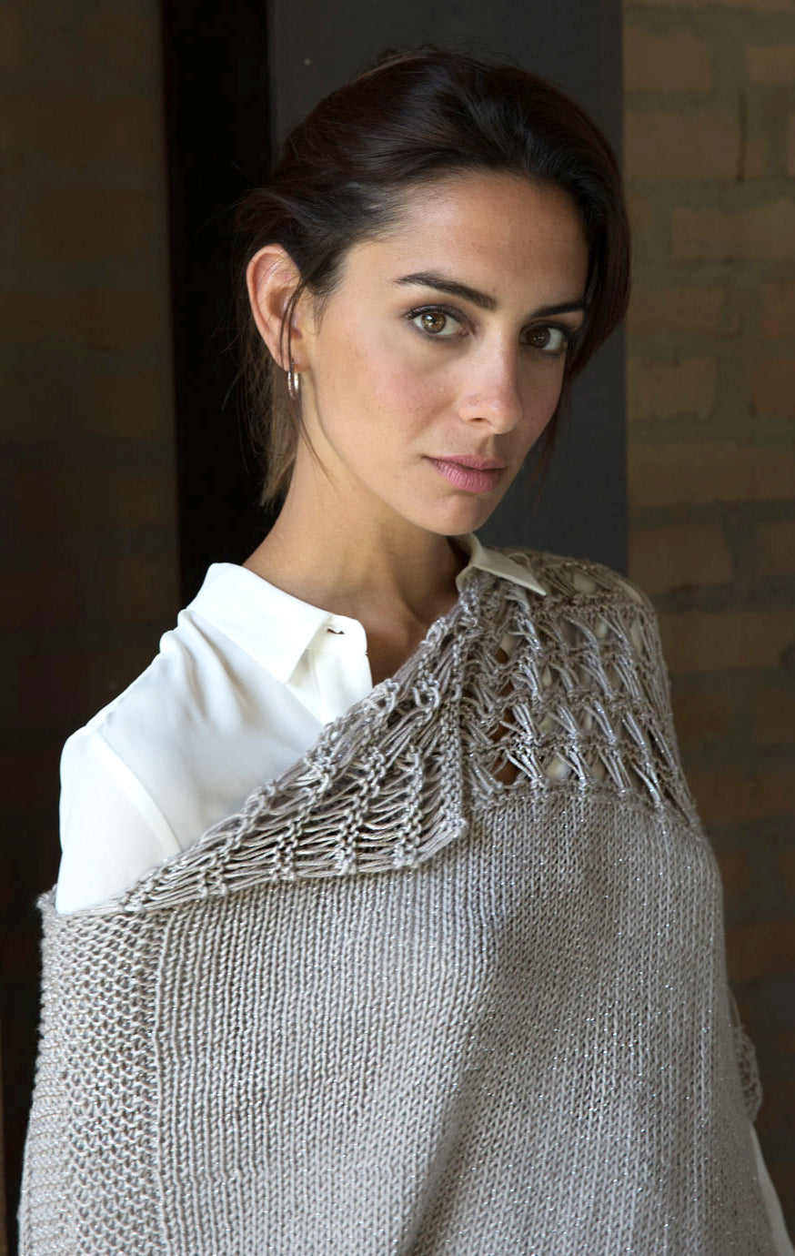 Un poncho per tutte le stagioni in microfibra illuminata da un sottile filo di lamé in tinta che dona un effetto cangiante alla lavorazione. Il punto a Maglie allungate incrociate dona un’elegante trasparenza al modello.