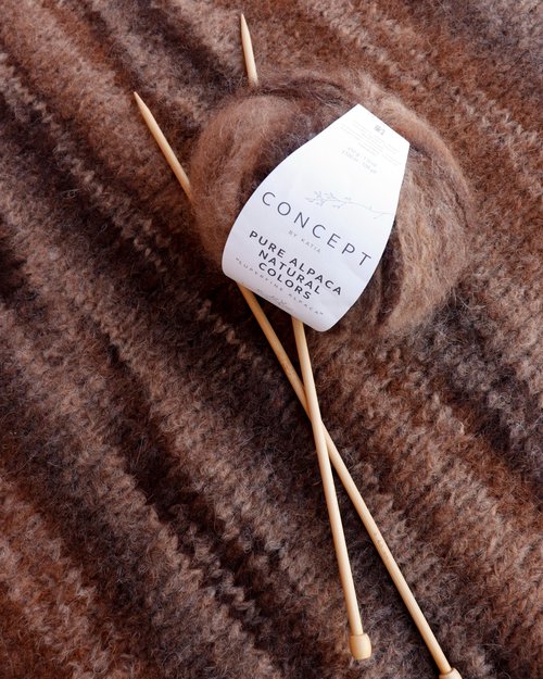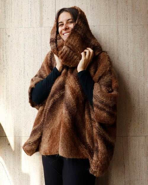 4 moduli quadrati lavorati a maglia rasata con un grande collo ad anello a costa inglese e il gioco è fatto. Il colore visone e la lavorazione diagonale rendono esclusivo il poncho realizzato con il filato Pure Alpaca Natural Colors di Concept by Katia