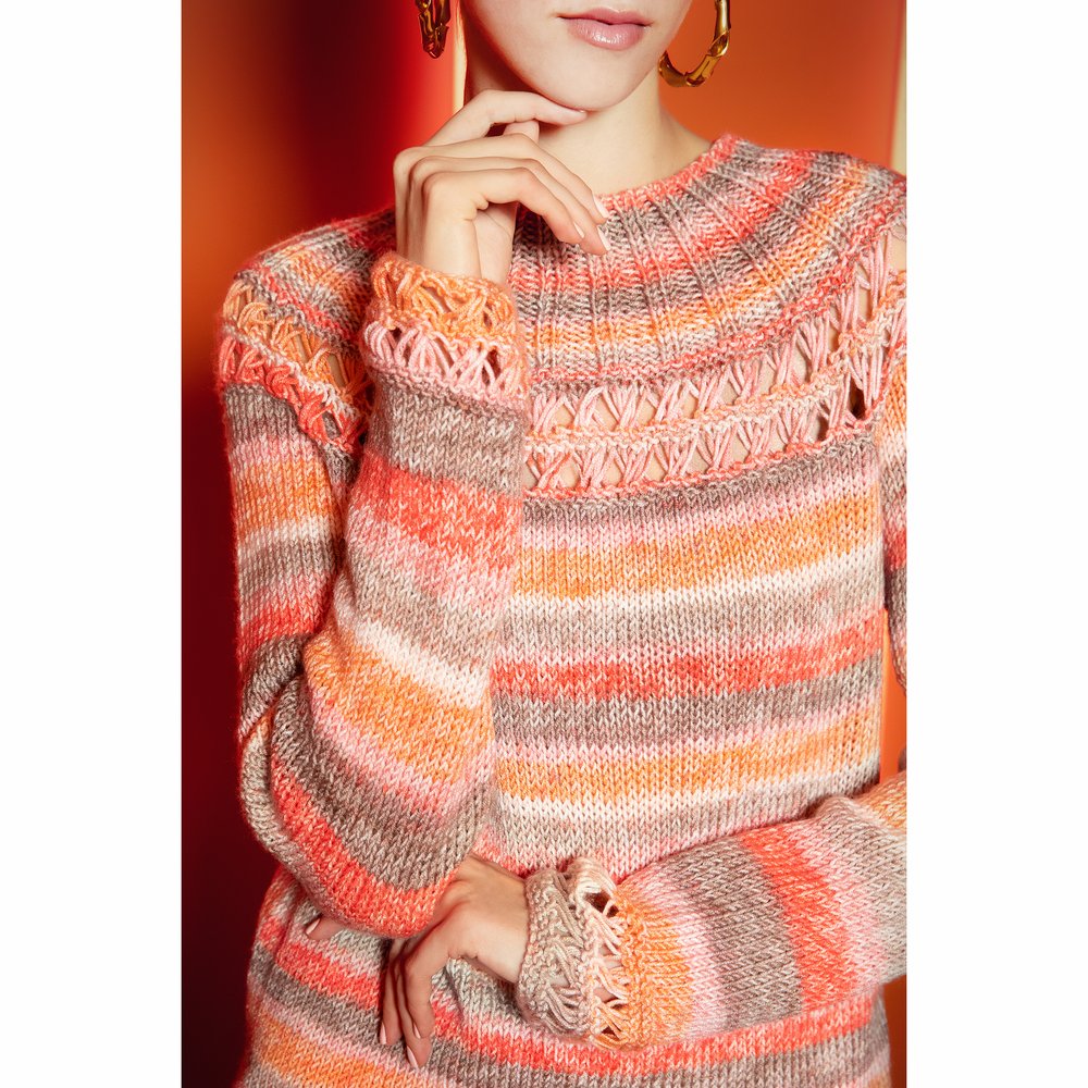 Tonalità calde e avvolgenti in rigature, per sottolineare un carrè impreziosito da trasparenze. Il filato utilizzato è “Mirage” di Miss Tricot Filati. Buon lavoro