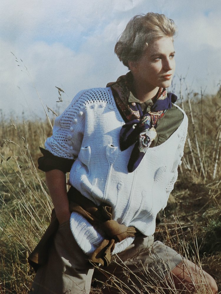 Week end in campagna in una giornata di sole con un pull che racconta storie di boccioli di fiori a rilievo e tanta fantasia. Il filato consigliato è una pura lana o anche un cotone da lavorare con i ferri 4 – 4 ½